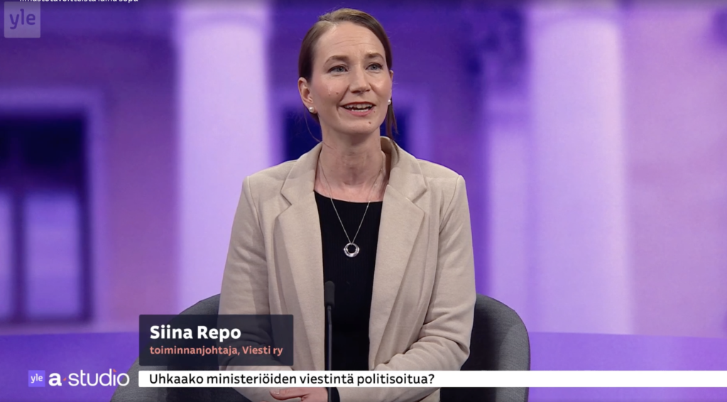 Viesti ry:n toiminnan Siina Repo vieraili Ylen A-studiossa 5. marraskuuta 2025 keskustelemassa ministeriöiden viestinnän keskittämishankkeesta.