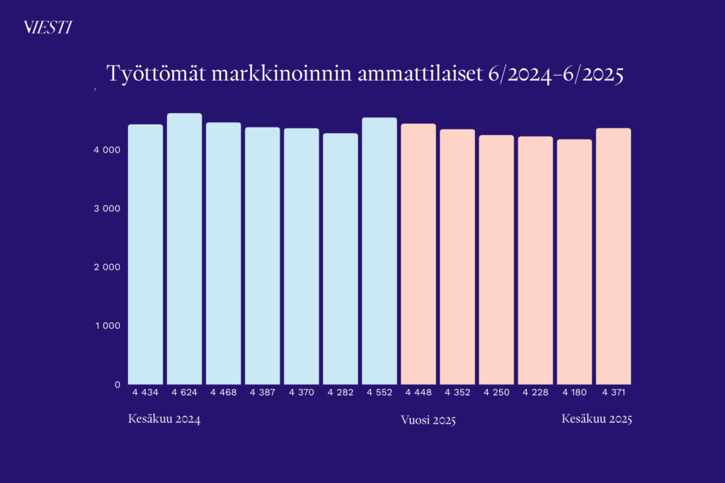 Mainonnan ja markkinoinnin ammattilaisten työttömyystilanne on viestijöiden tilannetta vakaampi. Työttömien mainonnan ja markkinoinnin ammattilaisten määrä on pysynyt melko tasaisena viimeisen vuoden ajan. Kesäkuussa 2025 heitä oli 4 371. Vuoden takaiseen lukuun 4 434 nähden laskua oli yhden prosentin verran.